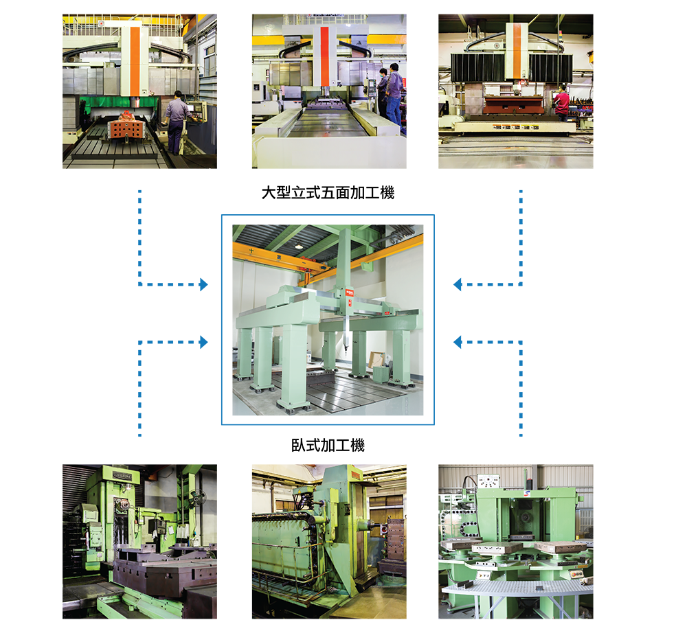 绮发以自有加工技术配合大型立式五面、卧式加工机设备,所有机床铸件经由专业五面加工机做一体式精密加工,及专业大型三次元量床做精密量测,确保单体部品几何精度。
